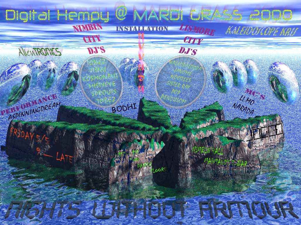 MARDIGRASS 2000 PROGRAMME "GOOD MEDICINE" FRIDAY 5TH MAY 8pm DIGITAL HEMPY in the Town Hall. 12 plus DJS, $10/$12 Chill out Zone at the E-Bar. SATURDAY 6TH MAY 10am Rainbow Café. POT POETRY & YARNDI YARNS. Hosted by S. Sorrensen & Alan Glover 11am CANNABIS FORUM Town Hall. 11am INDUSTRIAL HEMP - An Exciting Future with Dr. Andrew Katelaris, industrial hemp pioneer ,activist and inspiration. 1pm GLOBAL POT AND POLITICS -Where its all Heading! Speakers include Dana Larsen, Editor of Cannabis Culture Magazine, Canada. 2.30pm Dr. David Helliwells CANNABIS CAFE proposal for Nimbin followed by a MEDICAL MARIJUANA FORUM. Guests include John Jiggens, Australias foremost cannabis historian, Jamnes Danenberg and Tony Kneipp from Hemp SA, Lucy Charlesworth, Eve Sinton. Hosted by Harry Freeman, rainbow region legend 11.30am Hemp Olympix Torch & KOMBI KONVOY leave Lismore. Assemble at Conservatorium Carpark (corner Magellan & Dawson) from 10am 12.30pm Peace Park KOMBI KONVOY and the CANNABUS arrive in Nimbin for OPENING CEREMONY with Local Elders, Gunja Faeries and guest speakers including Princess Anne to open the Hemp Olympix 1PM HEMP OLYMPIX Peace Park. Heats begin for Joint Rolling, Bong Throwing, Growers Ironperson and new event POLICE TRIATHLON (Eye Gazing, Walk and Turn, One Leg Stand and count!!!) 4.20pm Participate in the Millennium Marijuana March and Launch of FREEDOM RIDE, a tour of NSW gaols culminating in Sydney Hemp Olympix., a tour of NSW gaols culminating in Sydney Hemp Olympix. Also launch of The CHURCH OF THE HOLY SMOKE. 5pm HEMP OLYMPIX COOL DOWN - DANCE THE DRUG LAWS AWAY - 6pm HARVEST BALL - Town Hall, top local talent including Folk'N'Cowticks,Pagan Love Cult, Tonk & Turner, Go,Solkin,Slippery & Red Eyed Frogs plus special dance guests - $10 & $12. 8.30pm Nimbin Bowling Club - Monkey and the Fish - (members & guests) 10pm Hemp Comedy Club at the Oasis Cafe with Alan Glover & Steve Sorrensen