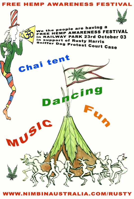 will be held in Railway Park to coincide with the court appearance. "We say that the real intention is to intimidate and criminalise people and to create fodder for their Drug War jails. We say the sniffer dog searches select the 'soft' targets of the poor and the marginalised. " At every court appearance to date a rally has been held in support of Rusty Harris, to protest against the use of sniffer dogs and support the re-legalisation of hemp. Past rallies have been well attended, colourful and peaceful protests with music, dancing, and a feeling of solidarity. "With each court adjournment, the support for me and the cause has grown, and so too the circles and networks of friendships," Mr Harris said. The Free Hemp Awareness Festival to coincide with Rusty's 13th court appearance will be held in Railway Park Byron Bay from 9.30am till sunset. This promises to be the biggest rally yet, with bands to include Earth Reggae, One 4 One, Monkey and the Fish, and Bo Kaan, as well as Bundjalung dancers and more. The event will also be supported by the Chai Tent providing free chai and cakes, as well as various stalls and hemp exhibitions. Media contact: Hemp Embassy in Nimbin Ph: 66 891842 or email Rusty rusty@nimbinaustralia.com |