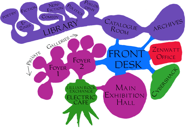Its a pretty spacey zenwatt this month as I have been working on the 3D aspect of zenwatt. How does the zenwatt lab look out there in cyber space? The 3D version is coming as fast as I am learning the program, below, you can see the work in progress, along with the floorplan, though one should keep in mind that the end result could be quite divergent. The cybershack web resources have been productively utilised in the areas of drug law reform, and forest saving, which has caused a backlog of submissions to the library, and a delay in the construction of the private gallery wing and the Lillian Rock exchange electric cafe... Peace, from the front desk, Zenwatt |